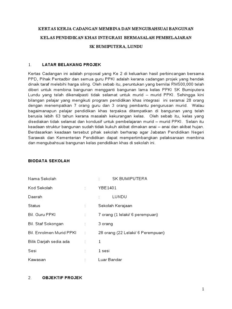No23jalan pulai perdan 112 taman sri pulai perdana 81110 johor bahru johor tel. Permohonan projek naik taraf kelas program pendidikan khas (ppki) negeri terengganu ppki 1 senarai ringkasan projek naik taraf program pendidikan khas . Pembinaan projek ini adalah sebahagian daripada projek pengisian kawasan lapang di sekolah selain memenuhi keperluan untuk mengumpul dan menghijaukan kawasan. Ia disusun mengikut format yang dilampirkan oleh pihak mybrain15. Tajuk projek cadangan membina 1 unit dewan terbuka di sekolah. Kertas kerja memohon sumbangan derma untuk tabung pembinaan masjid taman puncak jalil 43300 seri kembangan selangor darul ehsan alamat surat .
